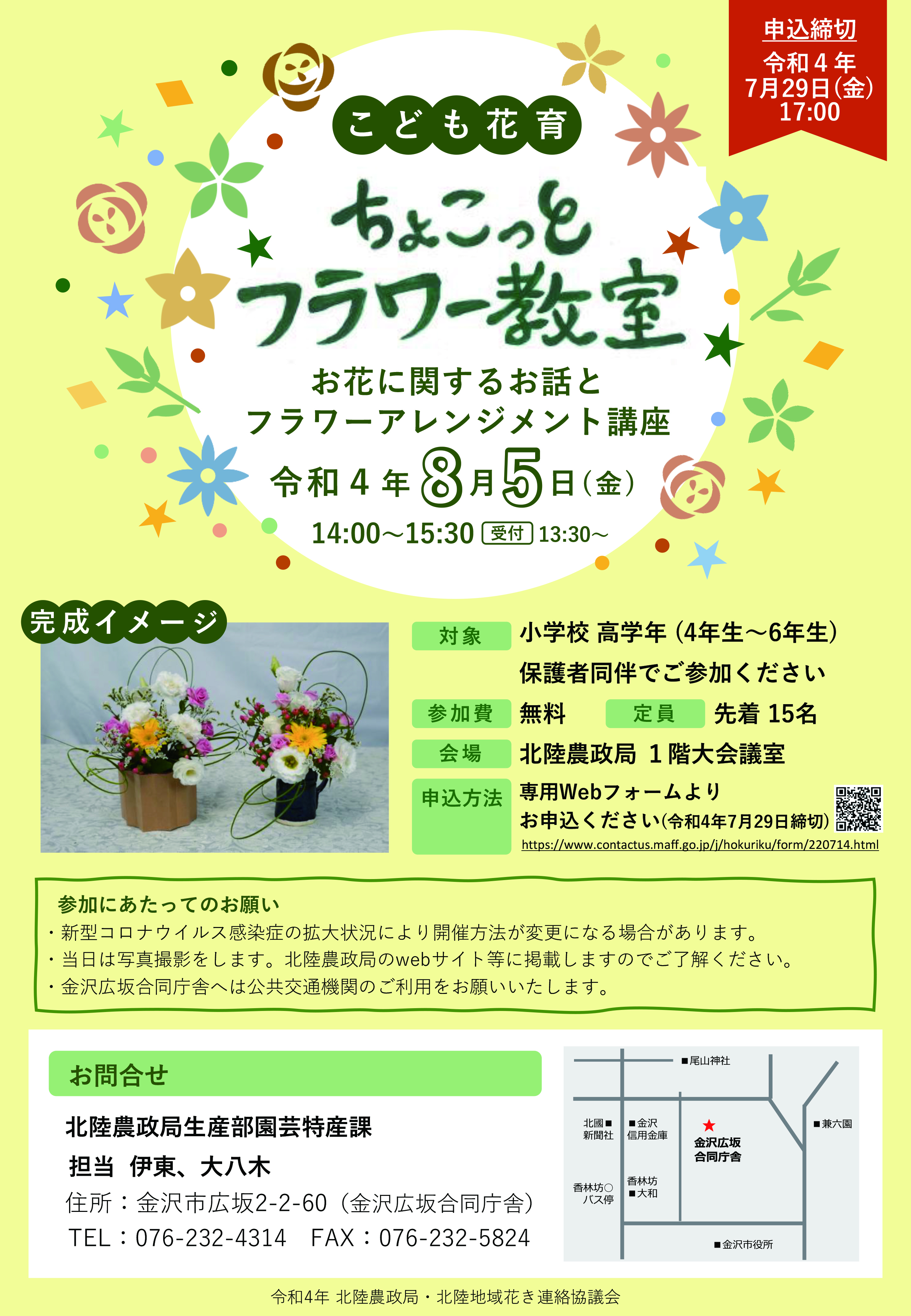 北陸農政局では、生花を使ったフラワーアレンジメントづくりに参加する小学生を募集します。