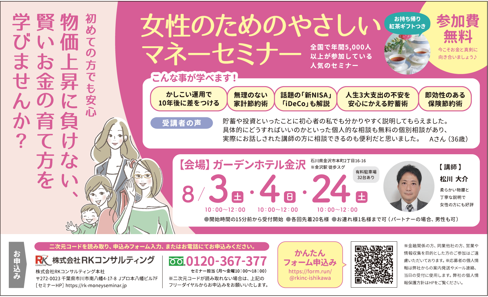 将来の資産形成について学べる 初心者向けで大好評のマネーセミナーが金沢市で開催されます。
