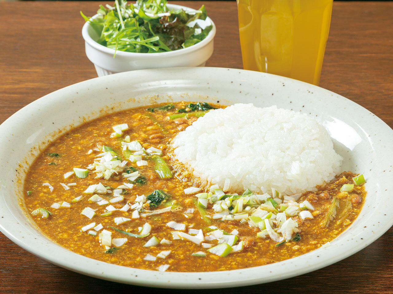 一見、意外な組合せの「納豆キーマカレー(1,350円)」。納豆の深いコクとスパイスが想像以上の相性で絡み合い、和風だしが全体をまとめてくれる隠れた逸品に! カレーの具材は、小松菜やオクラなど、その日の仕入れで提供。クセになる一皿を試してみて。
