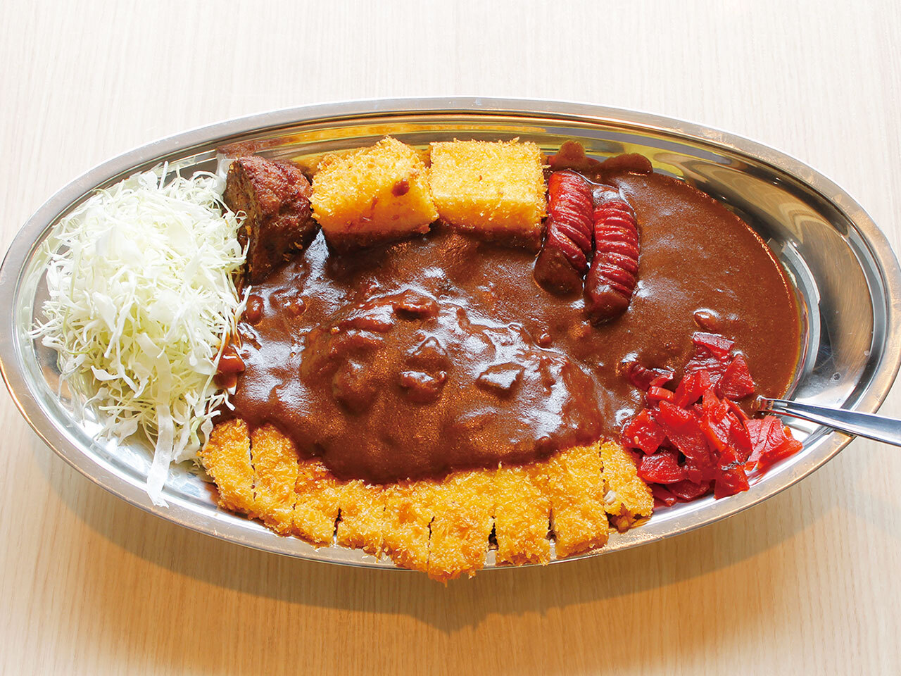 老若男女に愛されるカレーの名店といえばアルバ。トッピングも様々で、特におすすめは仕込みからすべて手作りのクリームコロッケとハンバーグ! 写真の満塁ホームランカレー(1,300円)は、トンカツ、クリームコロッケ、ハンバーグ、ウインナーが乗った大満足の一皿。