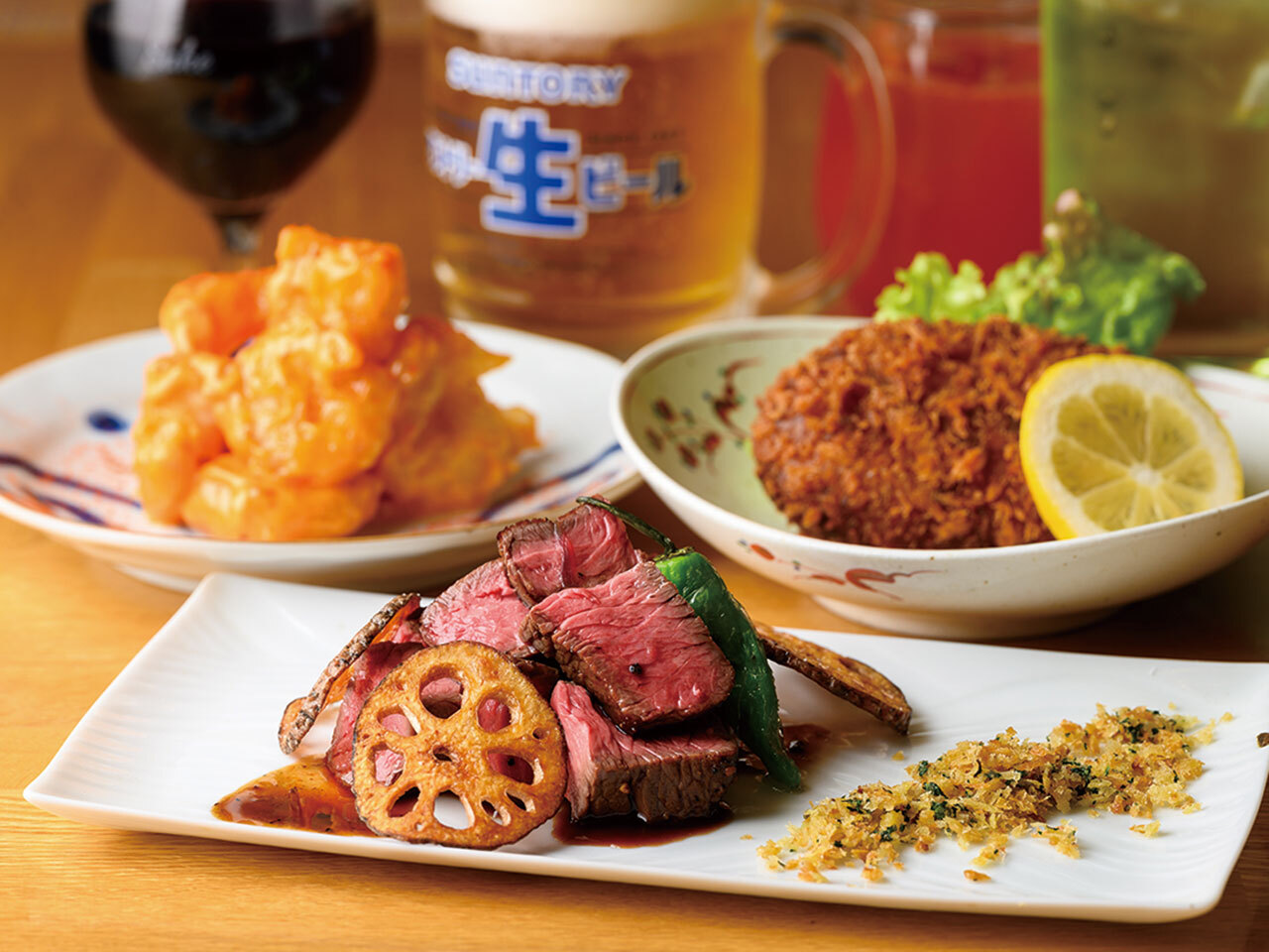 リーズナブルな価格で、和・洋のどちらも使った日替わり創作料理が堪能できる。旬の食材を使った料理が280円から食べられるのも魅力! さらに、90分1,099円の飲み放題は生ビール1杯付き(土日祝前日除く)で、500円で30分の延長ができるのも◎!