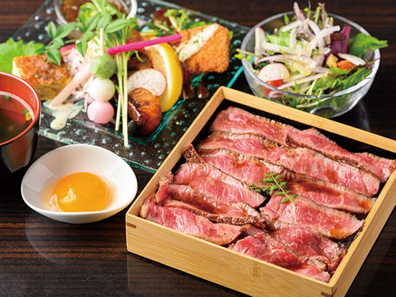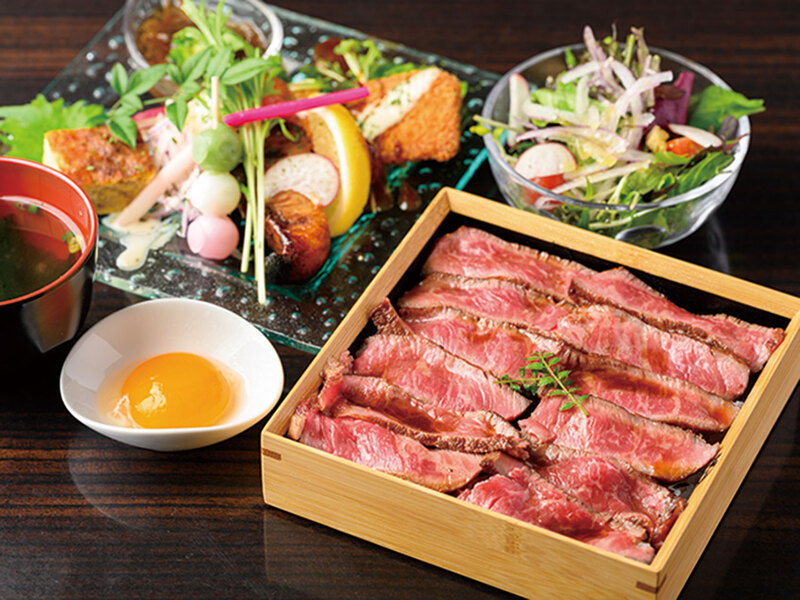 和牛ステーキ重2,200円(和前菜プレート、サラダ付)。卵黄と和牛の贅沢コンビ。