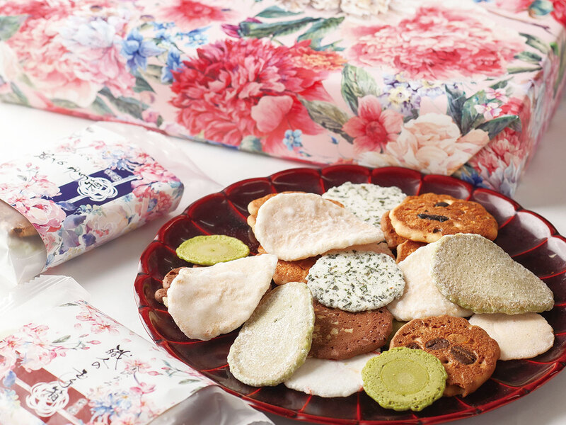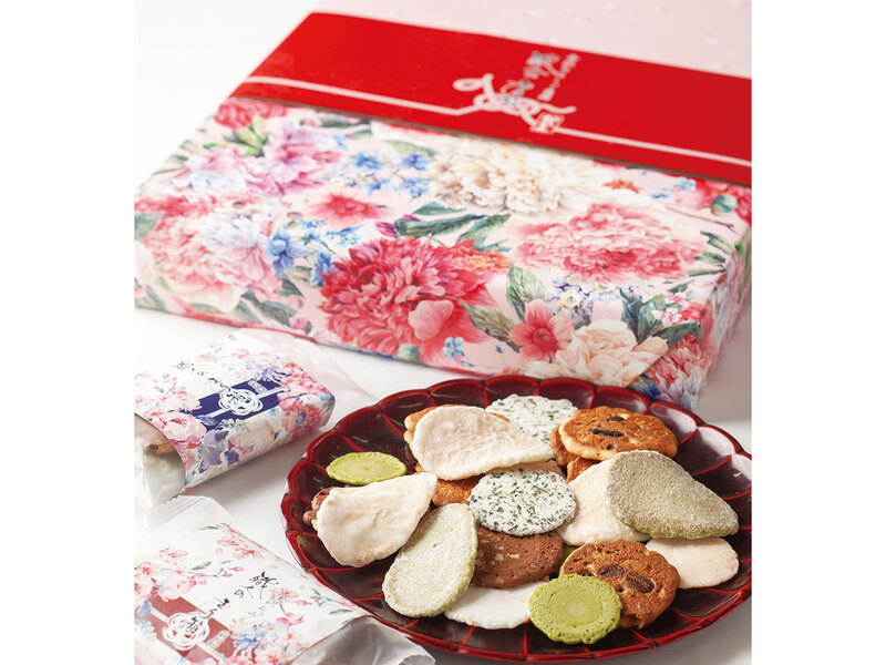常時40種以上の味が揃う「金沢百縁煎餅」。花柄の可愛いパッケージは手土産にも喜ばれること間違いなし!! 彦三本店・エムザ店もあり。