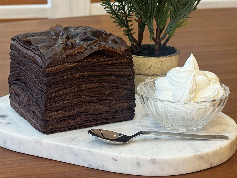 話題沸騰のミルフィーユ食パンにチョコ味が登場! 外パリッ、中ふわ、層をめくりながら特製ホイップクリームをつけてパクッ♪ 数量限定、予約がおすすめ。
