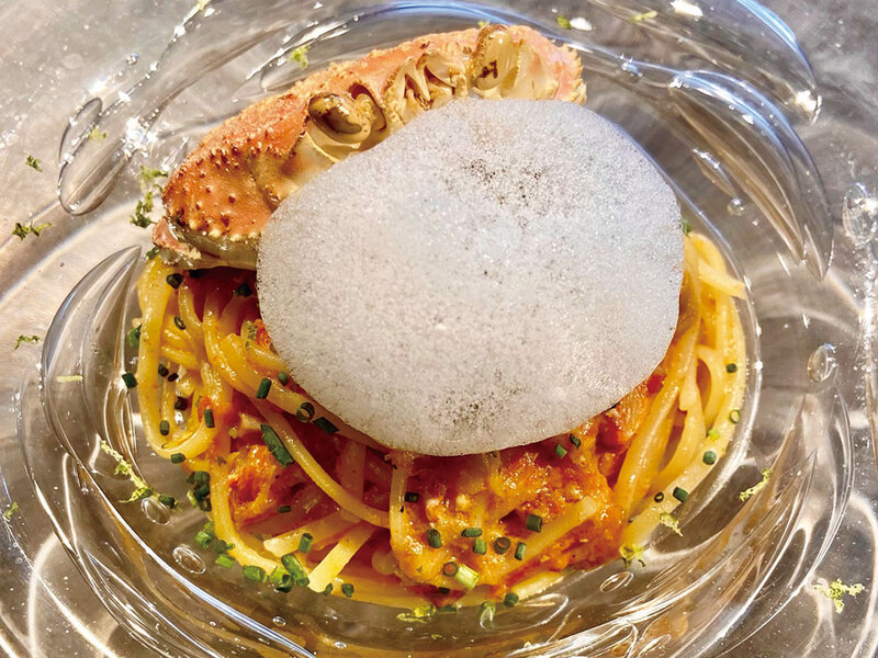 酢橘の香りと魚介の泡を添えた「香箱ガニのリングイネ」は、解禁日からの特別な一皿。12/20〜25はランチ8,500~12,000円、ディナー15,000円。