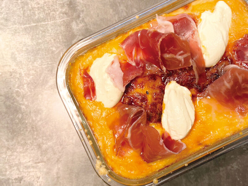 オーブンで軽く温め直すだけで、本格的な味が自宅の食卓を彩る。別添えのイベリコ豚生ハムと、マスカルポーネを添えれば、至福のひととき。蓋つきの耐熱容器のまま提供。