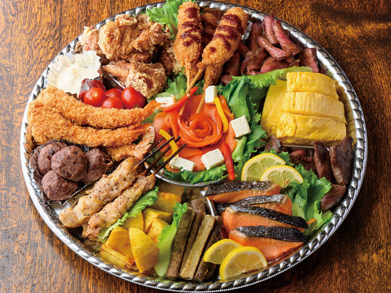 内容は、名物大福から揚げ、ローストビーフ、自家製ごぼう唐揚げ、さつまいもフライ、豚串かつ、厚切り牛タン、厳選焼き魚、エビフライ、出し巻き玉子、サーモンカルパッチョ、鶏のもも串、おはぎの全12品。2~3人前は4,000円。