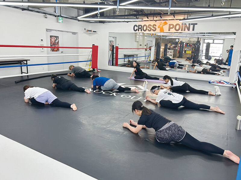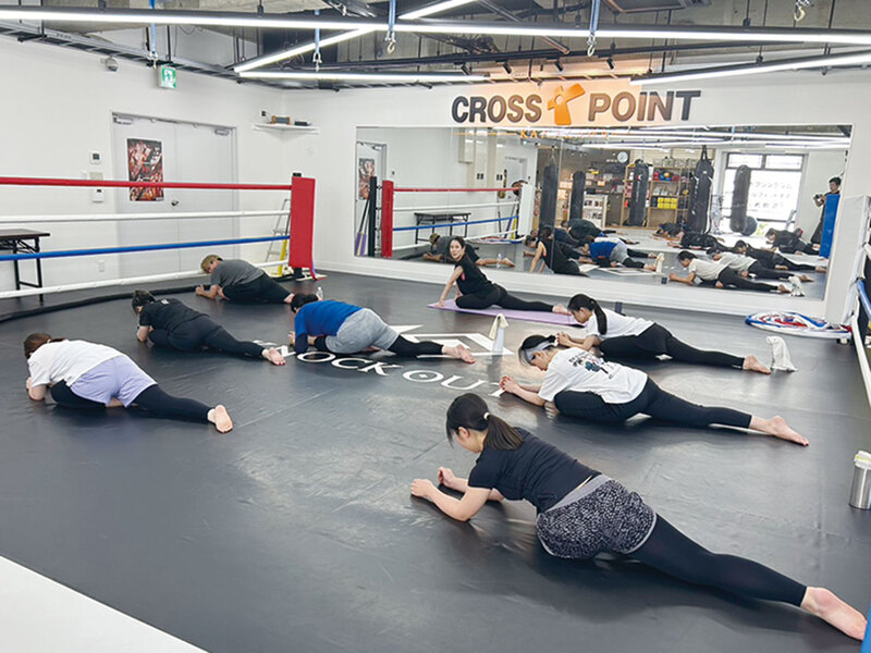 ストレッチや、キックの動きを取り入れた簡単な動きをしながら体を温める。ケガ予防にもなるのでしっかりと。