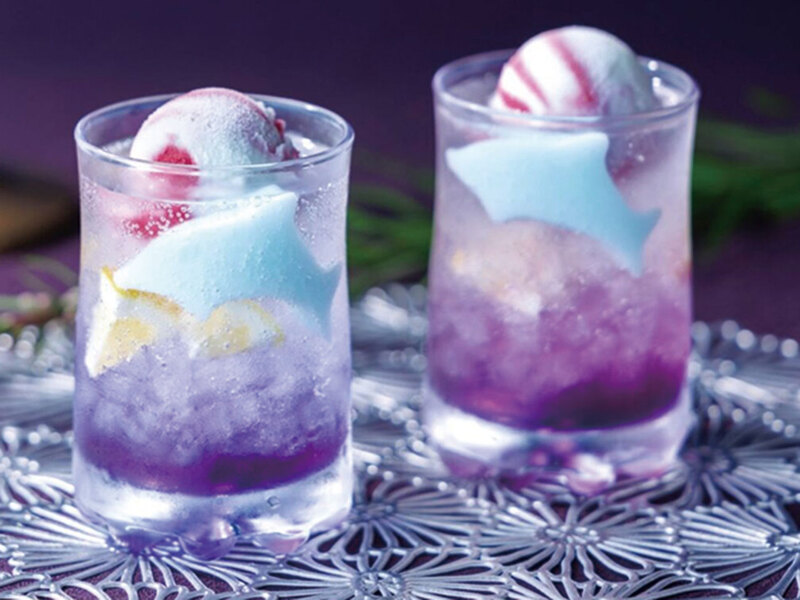 オプションの「オトナのハロウィンソーダ」も好評。イルカが泳ぐ可愛い一杯。アフヌンの売上の一部は、のとじま水族館の飼育支援に寄付される。