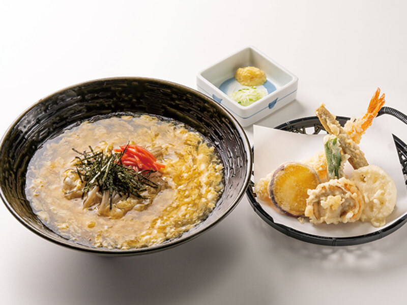 「天ぷら卵とじあんかけそば(1,400円)」。親子3世代で来店すると、 会計時申告で会計より5%OFFに! 県内全店4店舗で実施中。