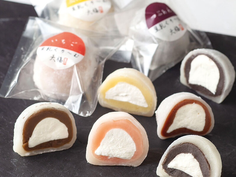 「豆乳くり~む大福(各種270円)」は、豆乳クリームの優しい甘さと低カロリーが特徴。罪悪感を忘れて、至福のひとときを存分に堪能できる♪ 味は、つぶあん・苺・棒茶・五郎島金時いも・胡麻・チョコの6種類! 冷凍発送も可能なので、ギフトにもおすすめ!