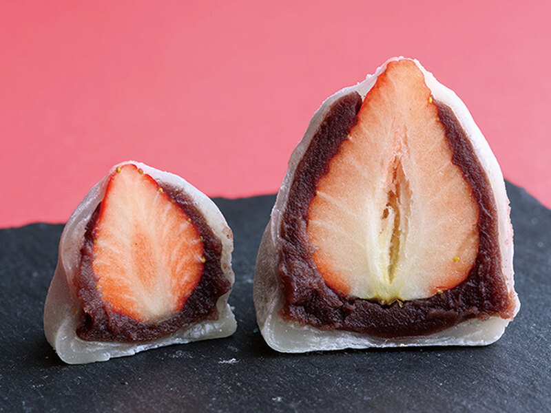 甘味の強いいちごとこしあんを特製の求肥で包み込んだ自慢の品。