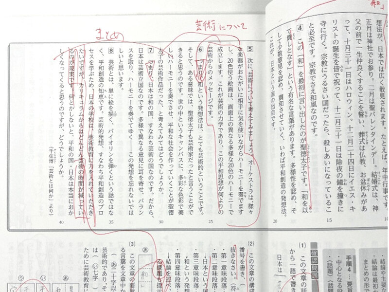 国語の添削は、経験豊富なプロ講師が責任を持って一人ひとりに直接指導。○×添削だけで終わらせず、なぜその答えになるのか、どのように根拠を見つけるのかまで徹底指導してくれる。赤ペン添削で真っ赤になったテキストに、生徒の「考える力」が少しずつ刻みこまれていく。