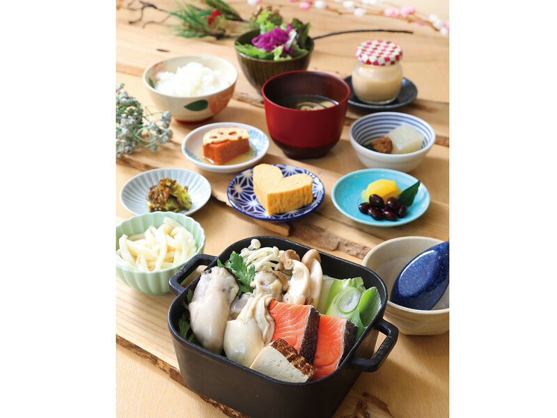 広島産2Lサイズの大ぶりな牡蠣と銀鮭をメインに、味噌をベースとした特製スープで味わう一品。他に黒毛和牛すきやき御膳、海老と鶏のゆず塩鍋御膳も。