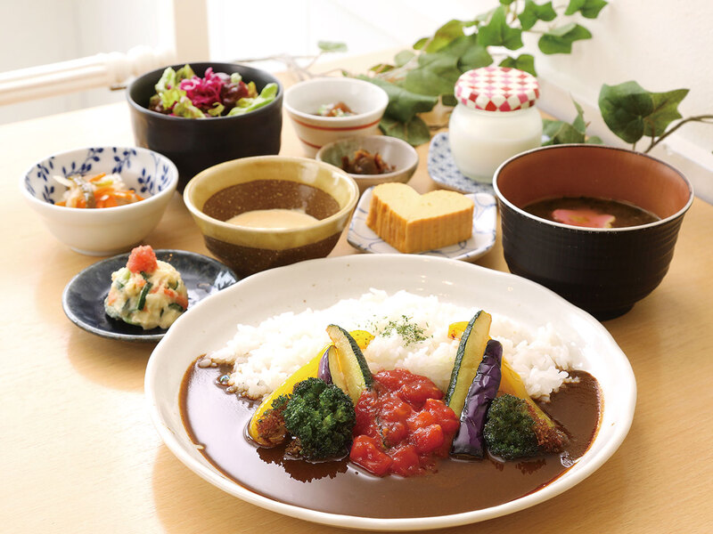鰹節と昆布を合わせた和だしがベースのスパイスカレー。トマトソースとタルタルソースで味変でき、1食で3度美味しい!!月替わり小鉢もボリューム◎。
