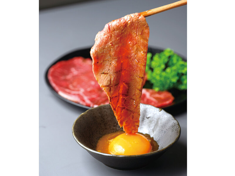 特製牛もも(玉子付き) 979円。特製牛ももは、玉子を絡めて食べることで、美味しさが引き立つ。新鮮な肉の旨味と玉子のまろやかさが絶妙に調和し、一口ごとに至福の味わい。特製のタレと絡めることで、さらに深いコクと風味が楽しめる。