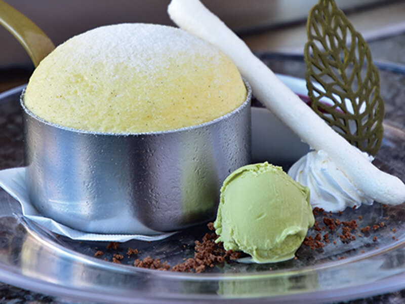 クリスマスディナーの最後を飾るのは、シェフが目の前でつくる「ふわふわスフレ〜ピスタチオジェラート添え〜」。贅沢なひと時を。