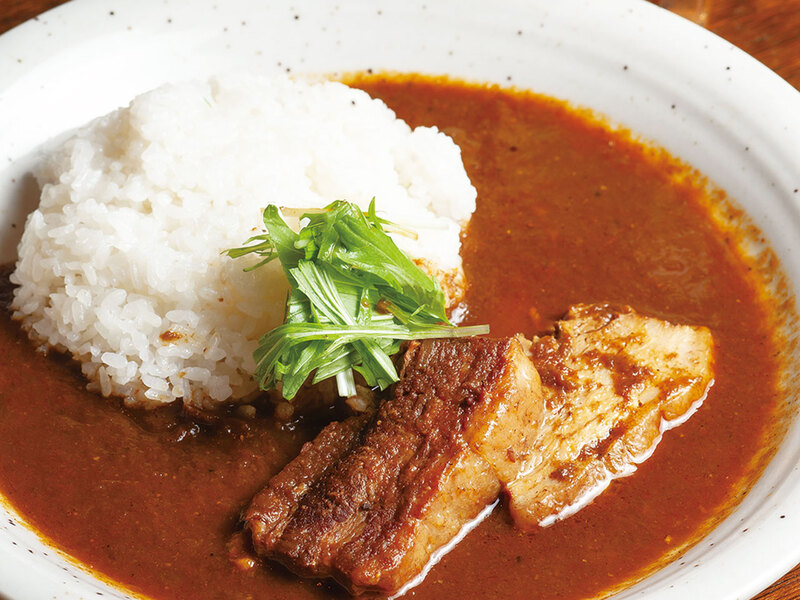 スパイスカレーの名店が誇る人気の「豚角煮カレーセット(1,500円、サラダ、ドリンク付)」は必食!2週で変わる、店長おすすめカレーも◎。