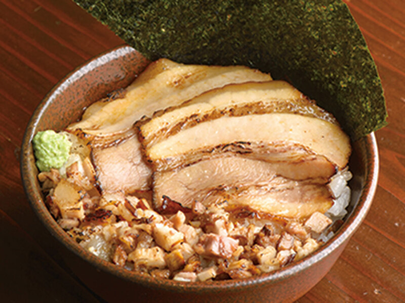 とろりとした炙りチャーシューがごはんを覆う。わさびをアクセントにして食べるのもオススメ。
