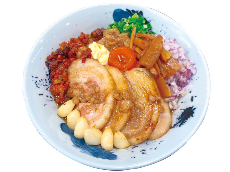 極上の背脂、トロトロに焼き上げた豚バラチャーシューと9種類のトッピングがインパクト抜群! キレのある醤油をベースに特製辛味で仕上げた超豪華なまぜそば。ライスは常時おかわり自由!