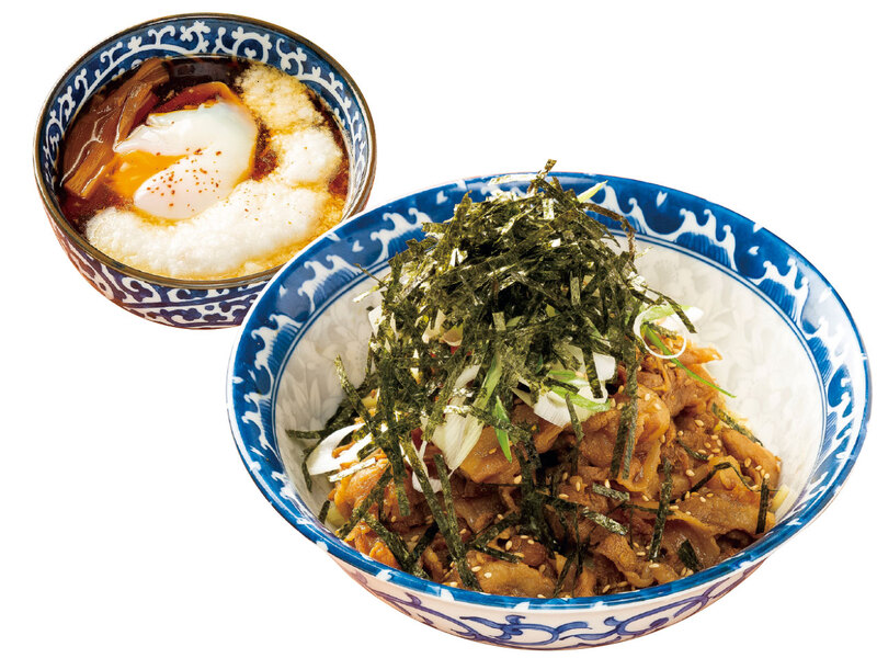 伝統の醤油ダレで香ばしく焼きあげた豚バラを豪快に盛り、たっぷりのネギ、刻み焼き海苔をのせた冷やし麺。温玉が入った冷製魚介ダレが麺と絡めれば、より一層美味に! 残ったタレは〆茶漬けで。