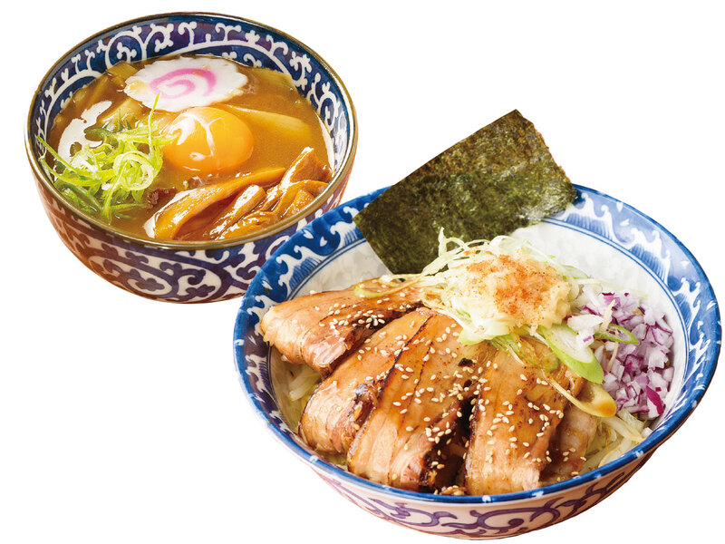 極太麺に超濃度の甘辛魚介ダレを絡ませて食べる極上のつけ麺がついに解禁! ローストレアチャーシューと能登豚の焼肉が豪華に盛り付けられ、つけダレの生卵を崩して麺と絡めれば、一味違うまろやかな味わいも楽しめる。