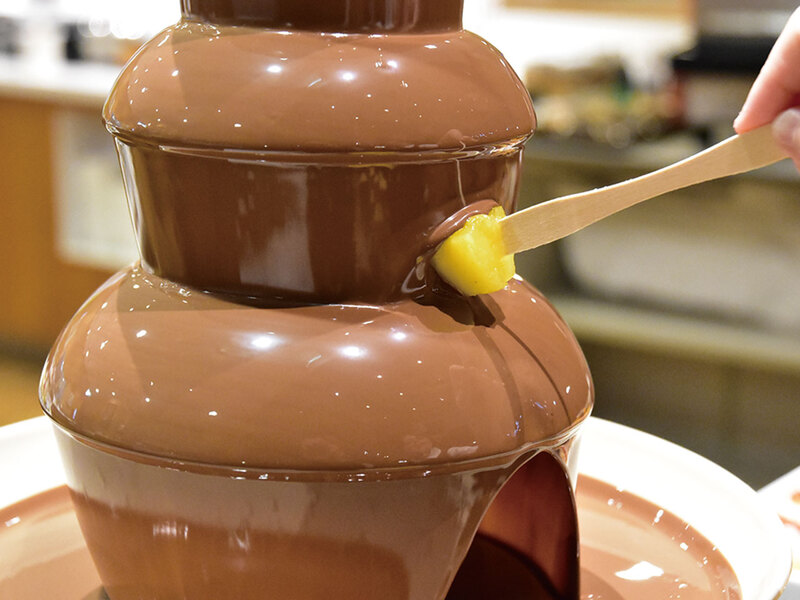 「金沢国際ホテル」入ってすぐの「クローバー」。大好評につき、デザートブッフェが継続決定。チョコレートファウンテンやソフトクリーム、ドリンク、パンケーキも◎!! 開催は火・水曜の14:45~17:00(16:30ラストオーダー)。