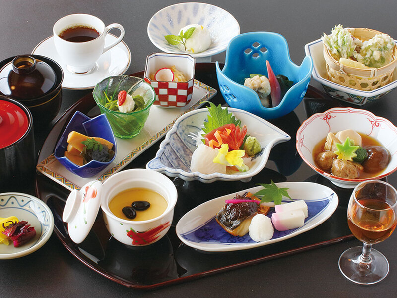 旬の食材を使用した本格的なご膳「昼ご膳 夢香山(むこうやま)3,300円」。季節の旬彩・天婦羅、刺身など豊富な料理が楽しめる。月〜金曜は食後のコーヒーサービスあり。