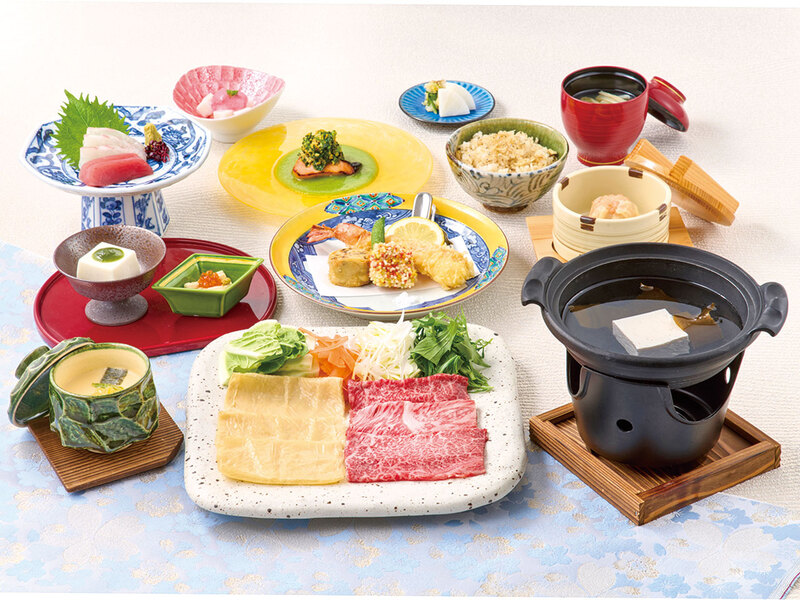 「黒毛和牛と湯葉のしゃぶしゃぶ」とお造りや天婦羅がついたおすすめのコース