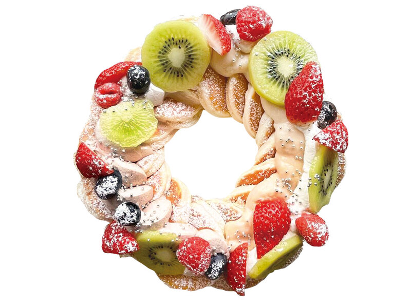 小さいパンケーキにフルーツがたっぷりのったリースパンケーキ。クリームはカスタード、チョコホイップ、塩キャラメルから2種類を選べる♪季節ごとに変わる限定パンケーキも要チェック!