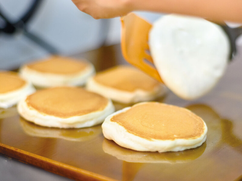 注文を受けてからメレンゲを立て、1枚1枚丁寧に焼き上げる出来立てのパンケーキは、ふわふわでしっとりとした極上の口どけ。小麦粉本来の味わいを活かし食べ応えも十分で、バターミルクの濃厚なミルク感と絶妙な塩味、焼き目のさくっとした食感がたまらない。