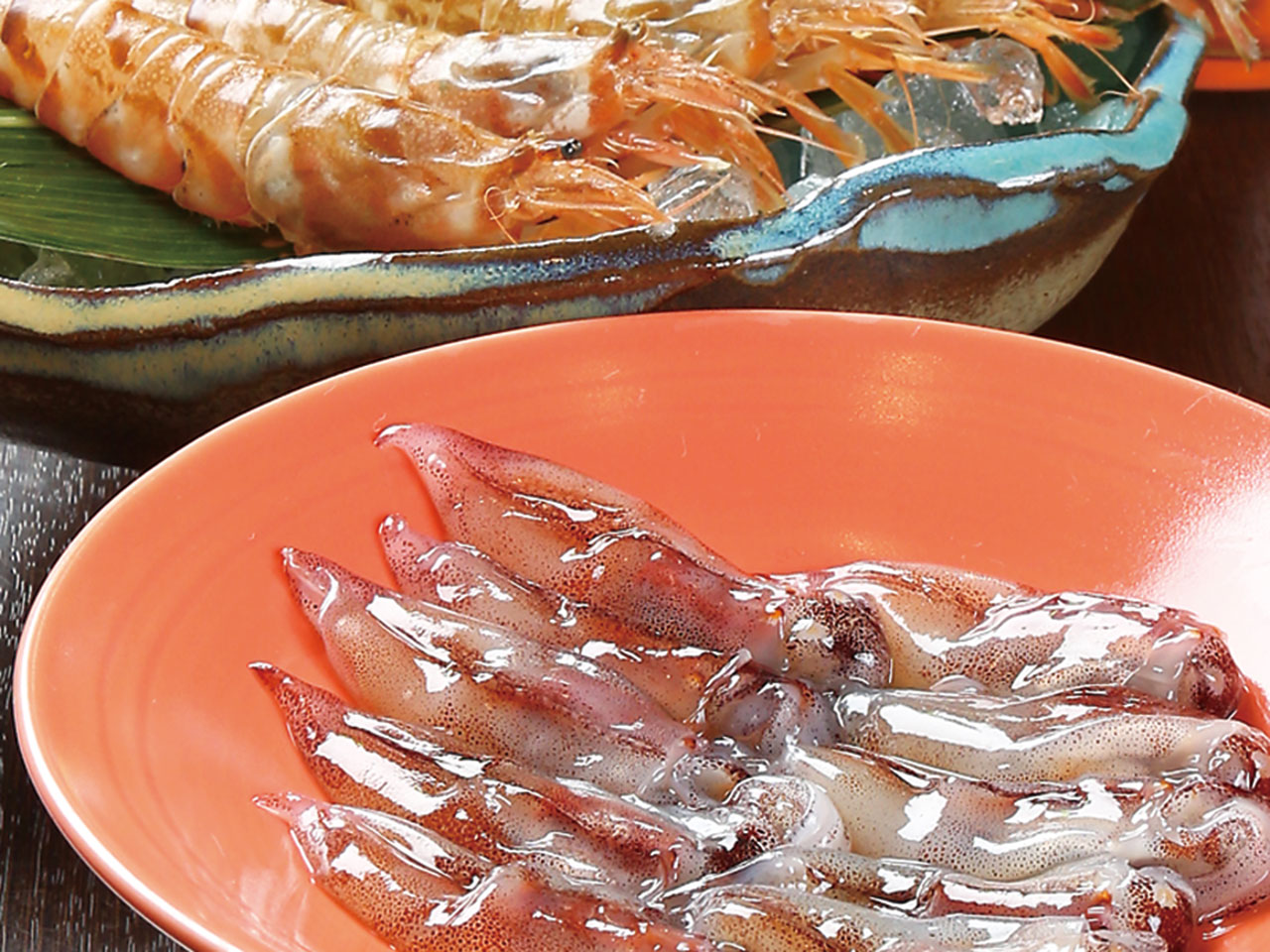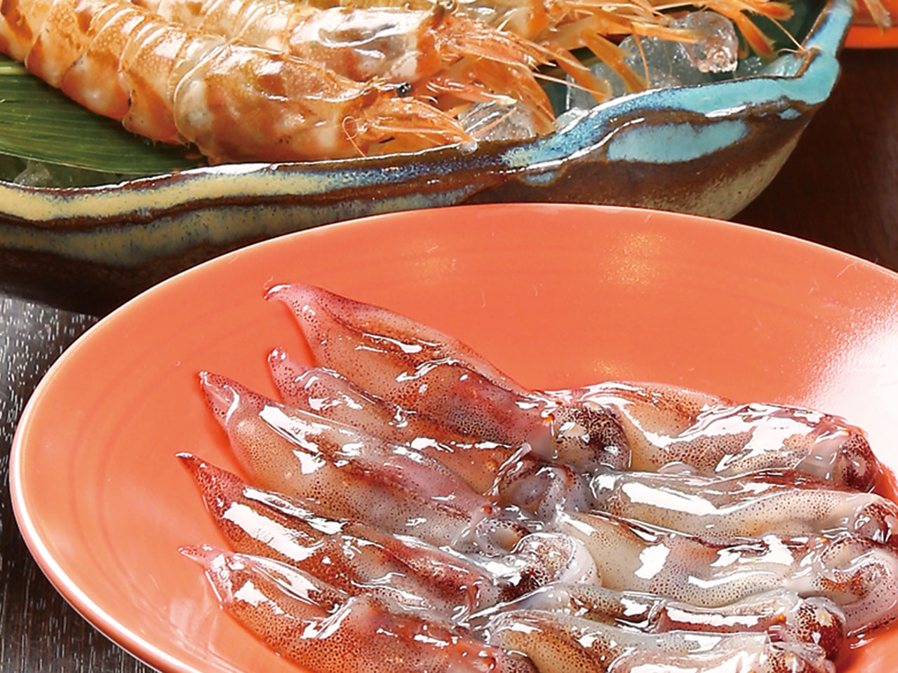 名物「カニクリームコロッケ」は単品648円。他にも、今の時季は「白ガスエビさしみ(1,404円)」、「ホタルイカの石焼き(1,296円)」がオススメ!