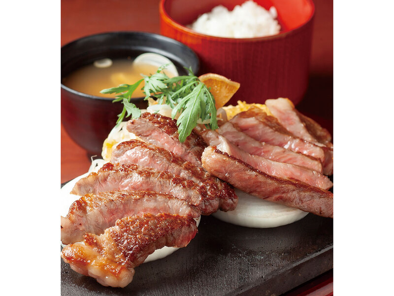 頂上ヒレ&サーロイン(各100g)に、ご飯、みそ汁、サラダ、デザート付き。A5等級の雌牛は、脂が甘く、至福のおいしさ。