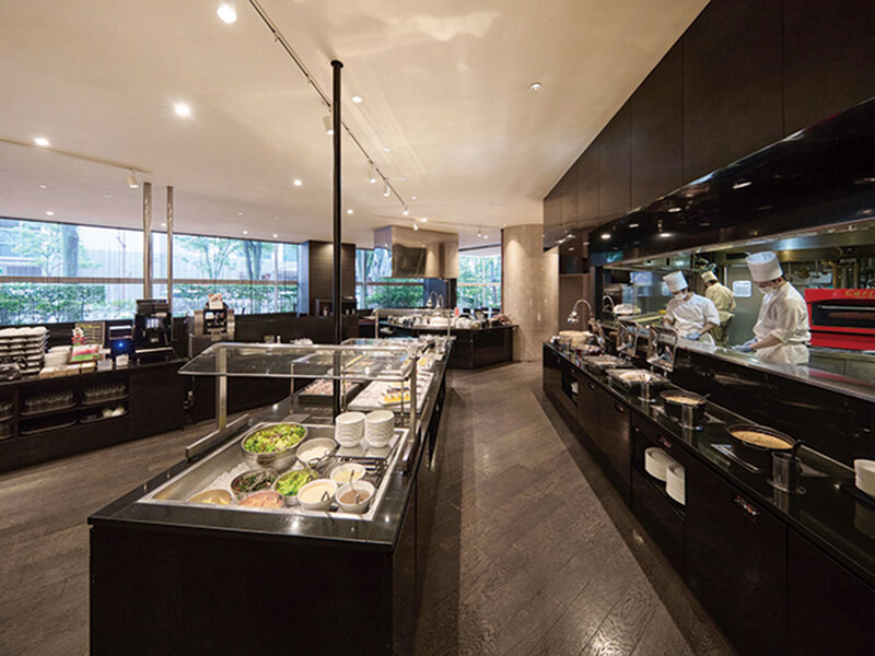 本格的なオープンキッチンシステムを採用した同店。朝・昼・夕は、いつでもホテルの贅沢ブッフェと品揃え豊富なドリンクが楽しめる! 不定期開催のデザートブッフェも人気。