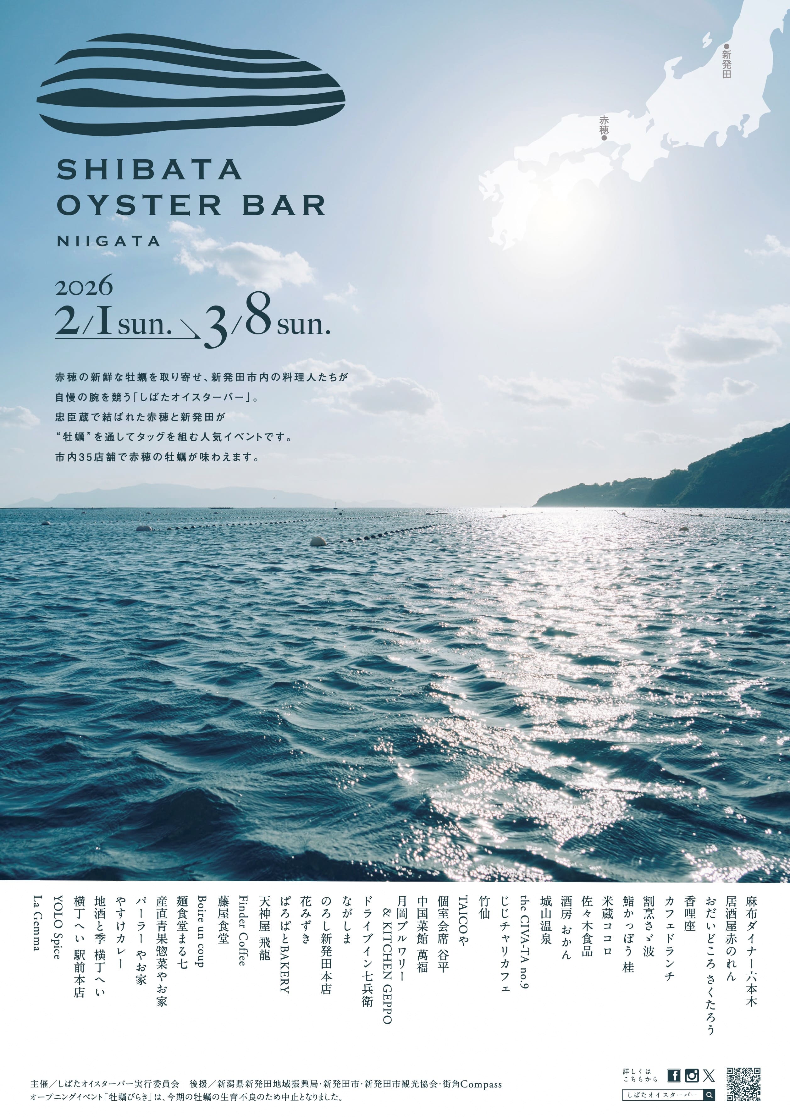 赤穂の新鮮な牡蠣を取り寄せ、市内の料理人たちが自慢の腕を競う「しばたオイスターバー」。忠臣蔵で結ばれた赤穂と新発田がタッグを組む人気イベントです。