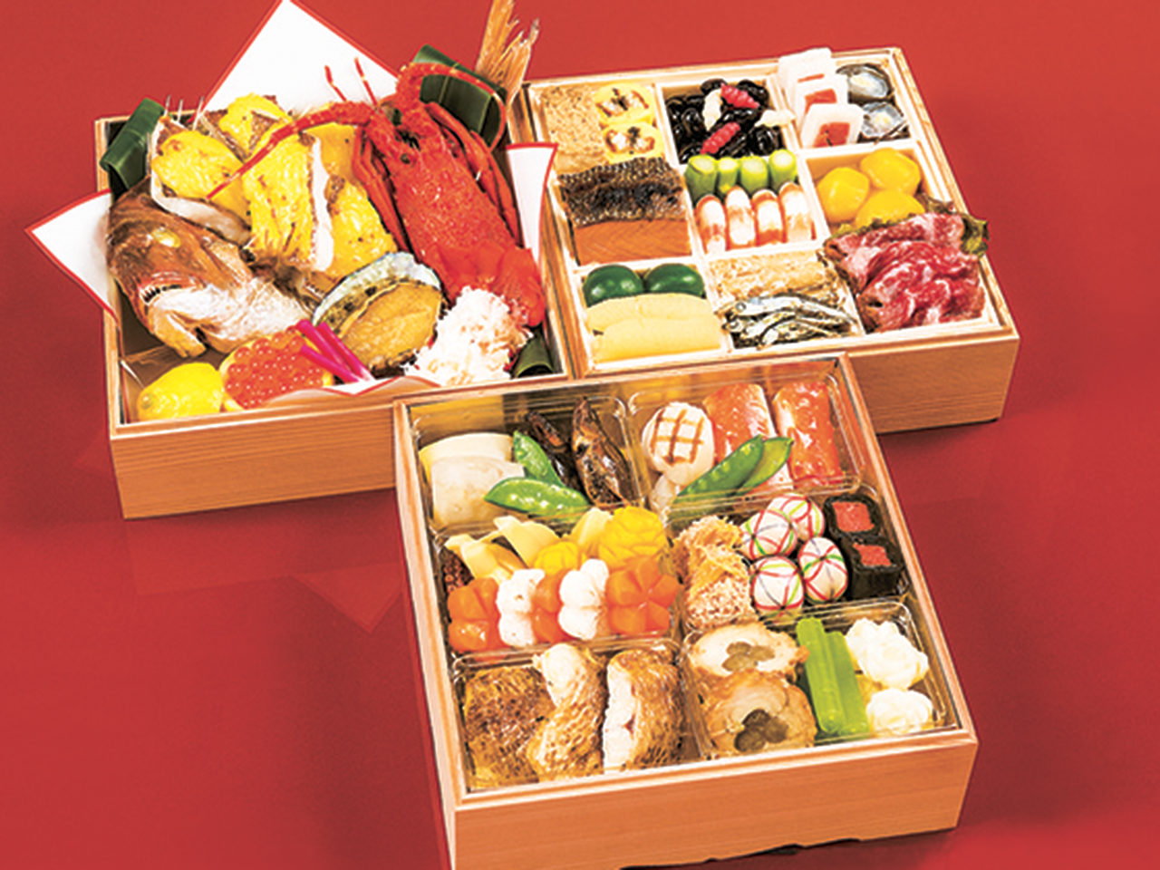 一の重/ロブスター黄金焼き、いくら醤油漬け、河豚一夜干し他全10品、二の重/鮭昆布巻、帆立貝柱燻製、鮭小川巻他全19品、三の重/オマール海老サラダ仕立て、ローストビーフ、燻製ローズサーモン他全10品