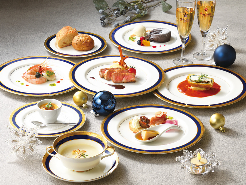 12/20(土)~25(木)の17:00~21:00(19:30L.O.)限定。フォアグラのフラン、ボタン海老と帆立のカルパッチョ キャビアのせ、カリフラワーのポタージュ、真鯛のパイ包み アメリケーヌソース、和牛モモ肉のグリル クリーミーマッシュ添え、フォンダンショコラとバニラアイス等全9品、乾杯スパークリングワイン付。前日までに要予約。
