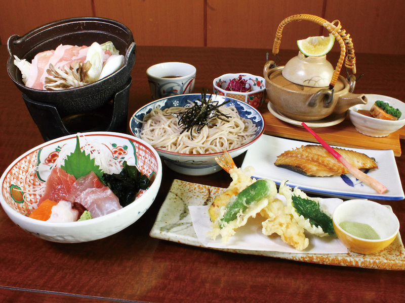 海鮮ちらしは日替りの新鮮な魚介がふんだんにのる。店自慢のそばつゆ付。他にも、そば+天丼、そば+かつ丼もあり。一品料理やオードブルのテイクアウトも可能。1人前〜注文可。当日OK(大量注文・オードブルは前日迄)。