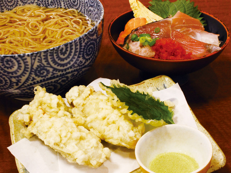 毎朝自店で 製麺するそばと、 海鮮丼のお得な セットが大人気!