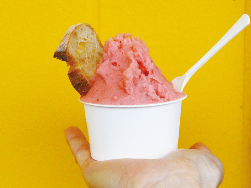 店内では手作りジェラートも販売。春のおすすめは自然な甘さの「越後姫」!温かいパンにジェラートを挟めた「バンズ・サンド(324円)」で食べてみて。