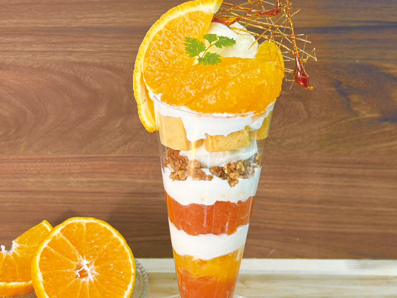 「不知火(しらぬい)パフェ(1,600円)」も◎! 不知火にオレンジサンギーヌのゼリー、ホワイトチョコクリーム、キャラメリゼしたアーモンドとフィアンティーヌが重なる。「越後姫パフェ(1,600円)」とともに、イートイン・季節限定。