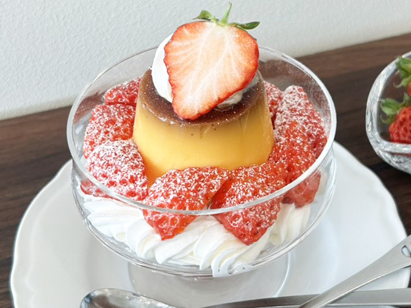 春限定! 自慢の卵を贅沢に使用した固めプリンとフレッシュな越後姫の下に、生クリーム、苺ジャム、スポンジケーキが重なり、ショートケーキのような味わいに。