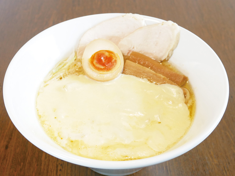 もっちり伸びるモッツァレラチーズ、濃淡塩スープ、自家製細麺が三位一体となり絶妙なバランスに! 麺や具材にチーズを絡めていただこう。
