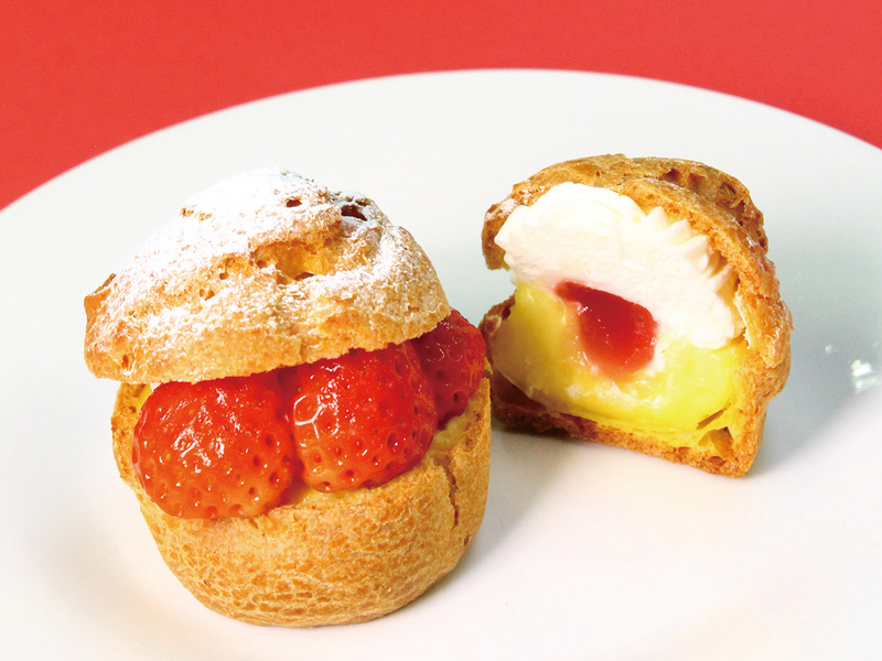 カスタードクリーム、生クリーム、苺ソースがたっぷり入った、季節限定のプレミアムシュー。2つのクリームとソース、フレッシュな越後姫が程よい甘酸っぱさで見事に調和する。
