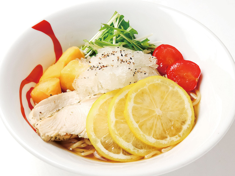 砂糖漬け冷凍ミニトマト、砂糖漬け冷凍檸檬、蜂蜜檸檬シャーベット、フローズンマンゴー、サラダチキンがのった一杯。つるシコ麺も◎。