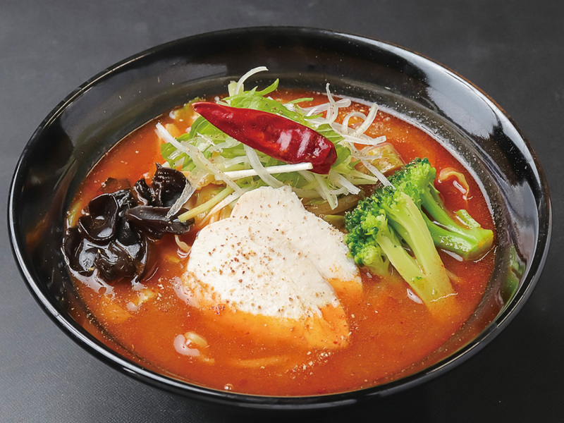 しっとり食感の自家製鶏チャーシューと、彩り豊かな6種の野菜を贅沢に使用。花椒のシビれと香りをきかせた、マイルドな旨辛麻辣麺。