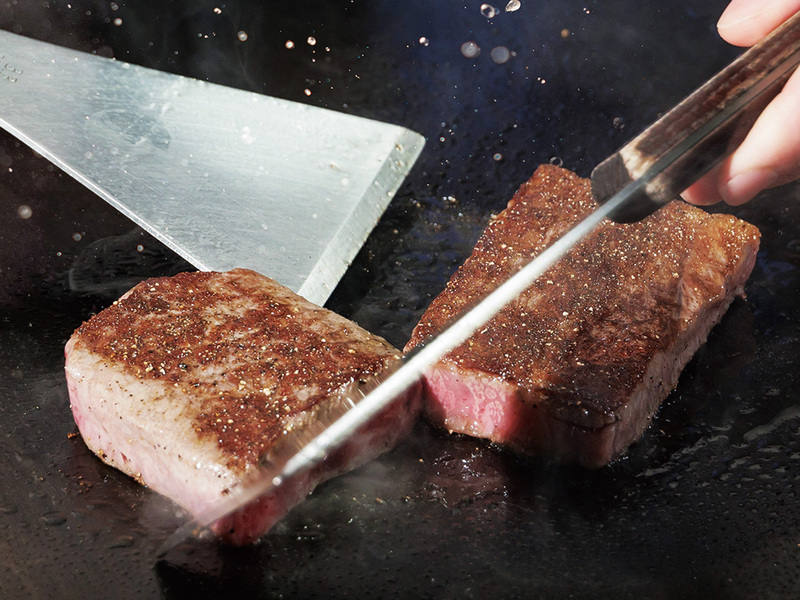 日本庭園を望む鉄板カウンター席、特別感ある個室カウンター席を用意。ランチ、ディナー共にお肉のフランベパフォーマンス有。デザートは築100年の趣ある洋館または和室へ案内。
