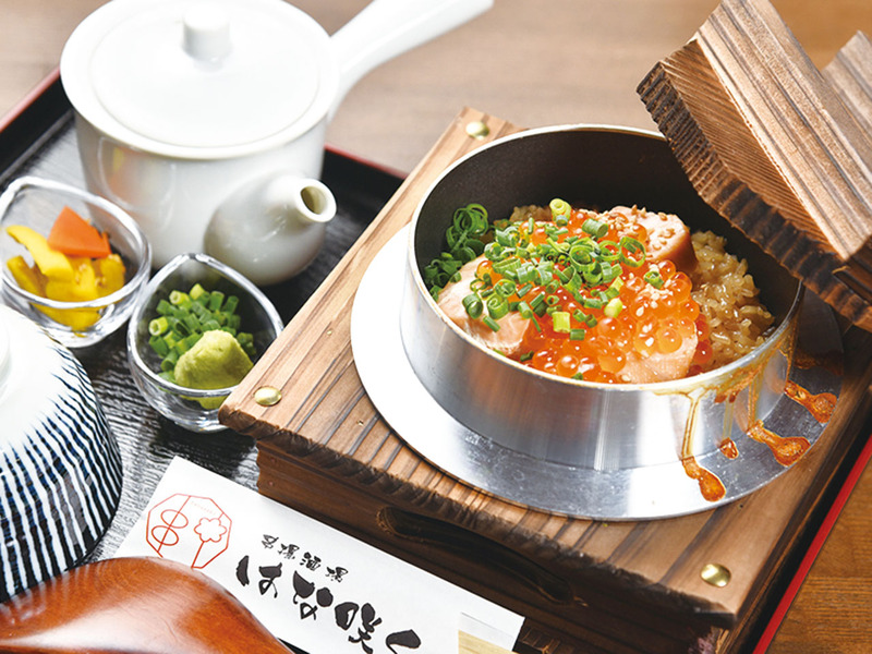 これを目当てに来店する人がいるほど人気の釜めしは680円~。写真は「サーモンいくら釜飯(800円)」。少し時間がかかるので早めの注文を。+150円の「ひつまぶしセット」も◎。