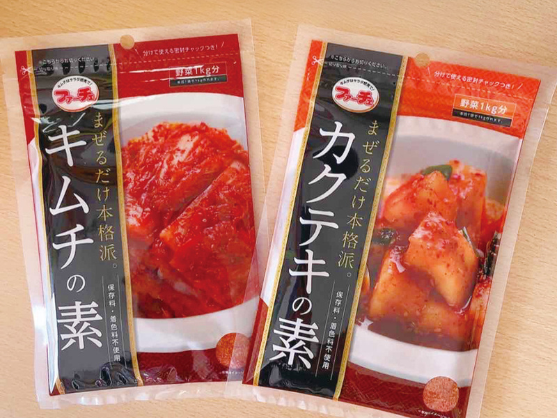 「キムチの素」「カクテキの素」を白菜や大根にまぶして一晩おけば、本格キムチの出来上がり! 販売店など詳しくはInstagramへ。