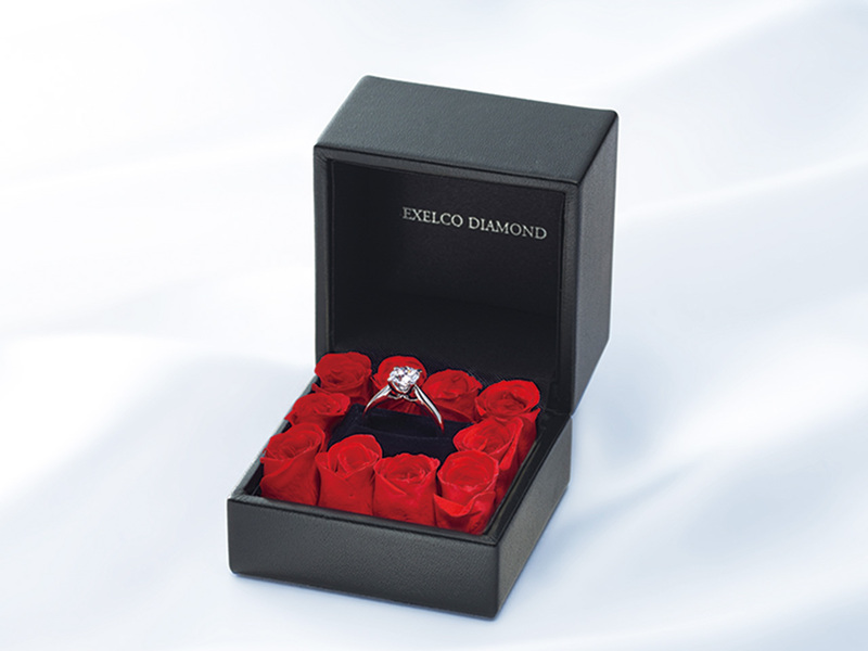 プリザーブドフラワーのバラ10本が彩るボックスにダイヤをセットすると、「最愛」を意味する11本のバラが揃う。ロマンティックな演出で、サプライズプロポーズを。